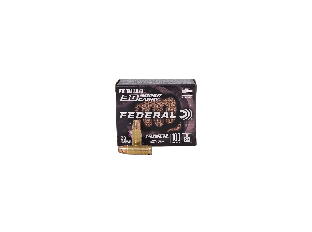The Federal Punch .30 Super Carry 103 Grain Jacketed Hollow Point Ammunition features a 103-grain Punch Jacketed Hollow Point (JHP) bullet, designed to provide excellent accuracy and devastating terminal performance. The Punch JHP design ensures reliable expansion and consistent penetration upon impact, making it an ideal choice for personal defense and concealed carry situations.